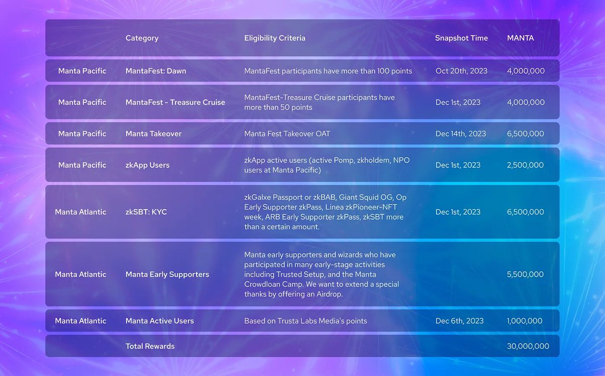 • Airdrop Rewards: 30,000,000 $MANTA (3% of total supply) is allocated for airdrop rewards to supporters and users in the Manta ecosystem on both Manta Atlantic and Manta Pacific. See image for specific criteria