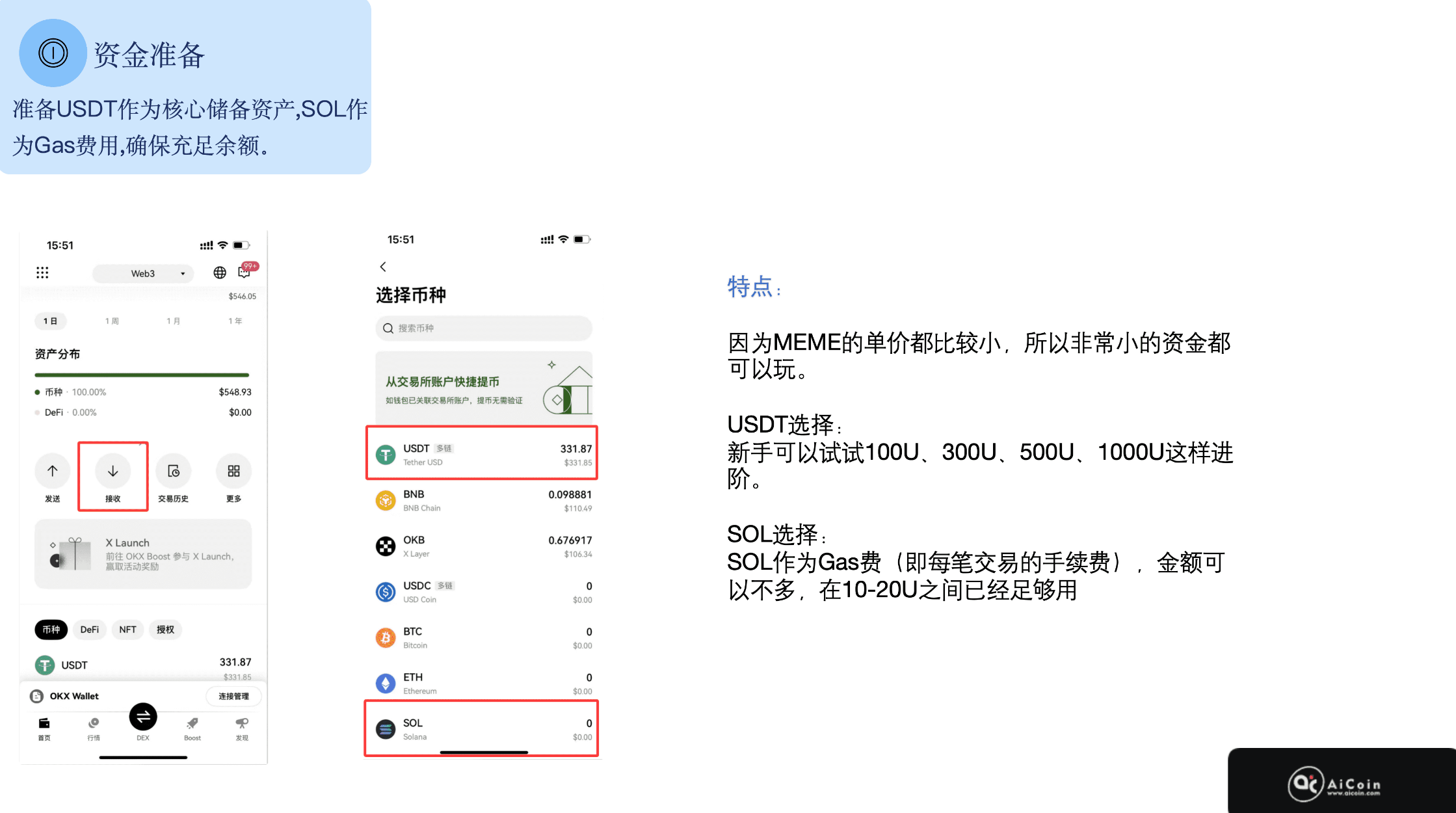As a beginner, you should choose investments with "low thresholds and room for trial and error." MEME coins generally have low prices, making them suitable for initial attempts. Therefore, you can start by depositing 100 USDT and then 10-20 USDT of SOL. This scale allows you to experience the trading process while controlling risks. Here’s a brief explanation of the roles of these two coins: USDT acts like the base pricing currency on DEX, making it convenient for buying and selling other coins;