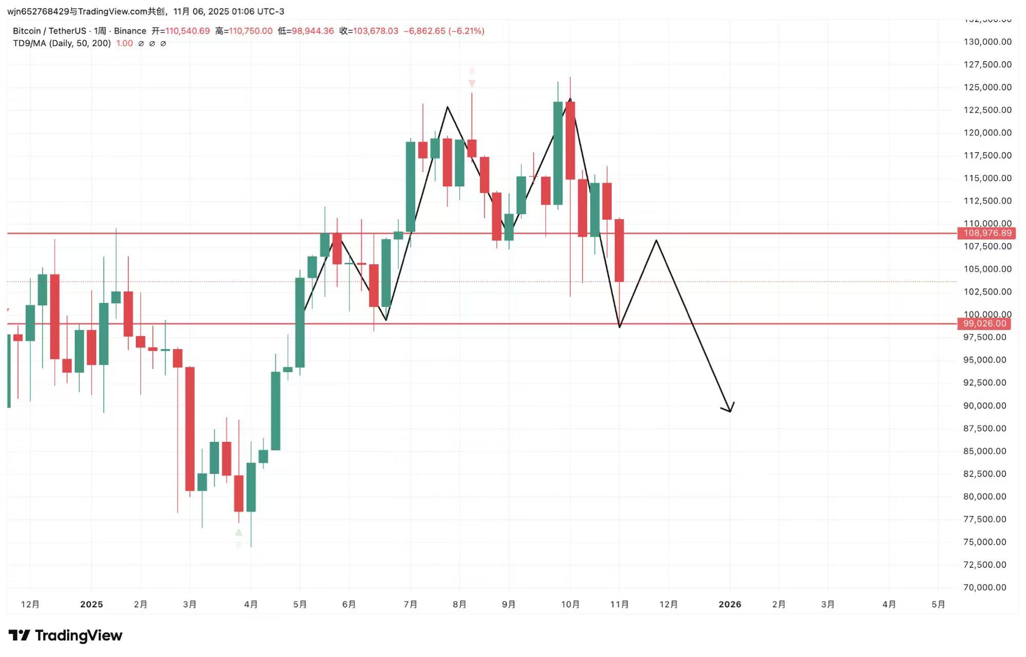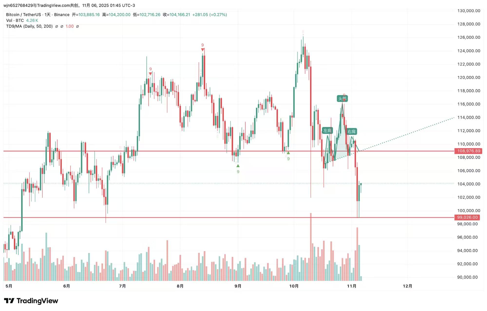 1小时级别:头肩底结构已经形成,根据1:1等比上涨,有概率最高到11w附近