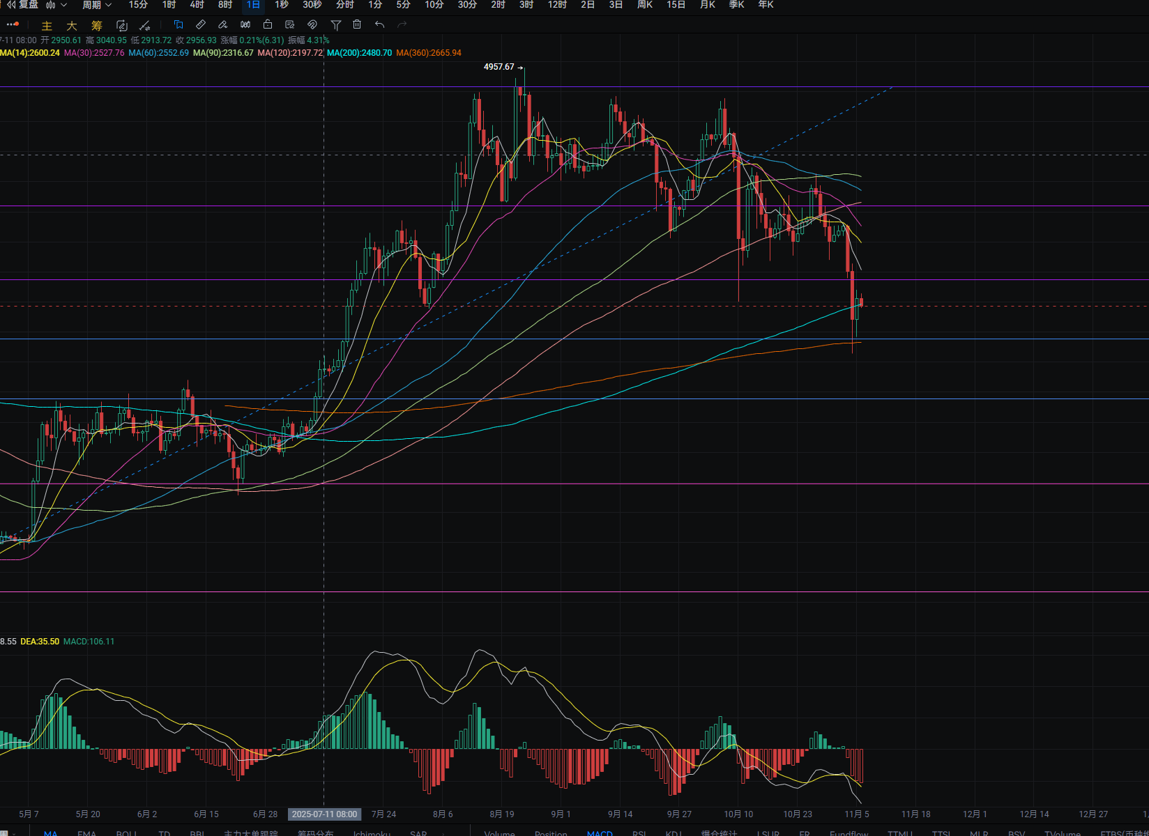 以太支撑:第一激进支撑3340附近,第二个支撑3088附近底部支撑位于2888.