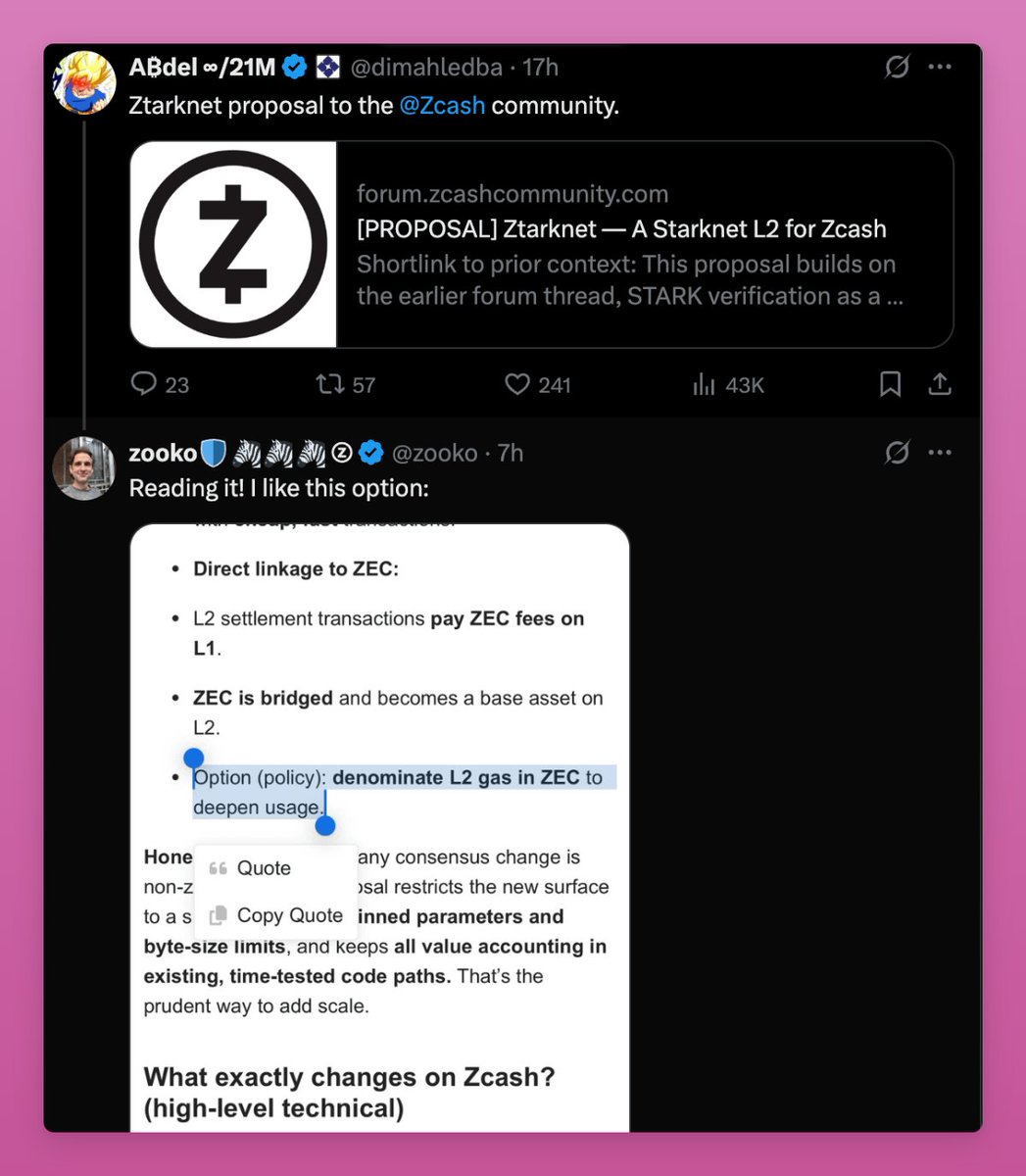 Now, Starknet proposes adding a STARK verifier so L2s can run on Zcash without touching the L1. Becoming a competitor not for just BTC but also for ETH.