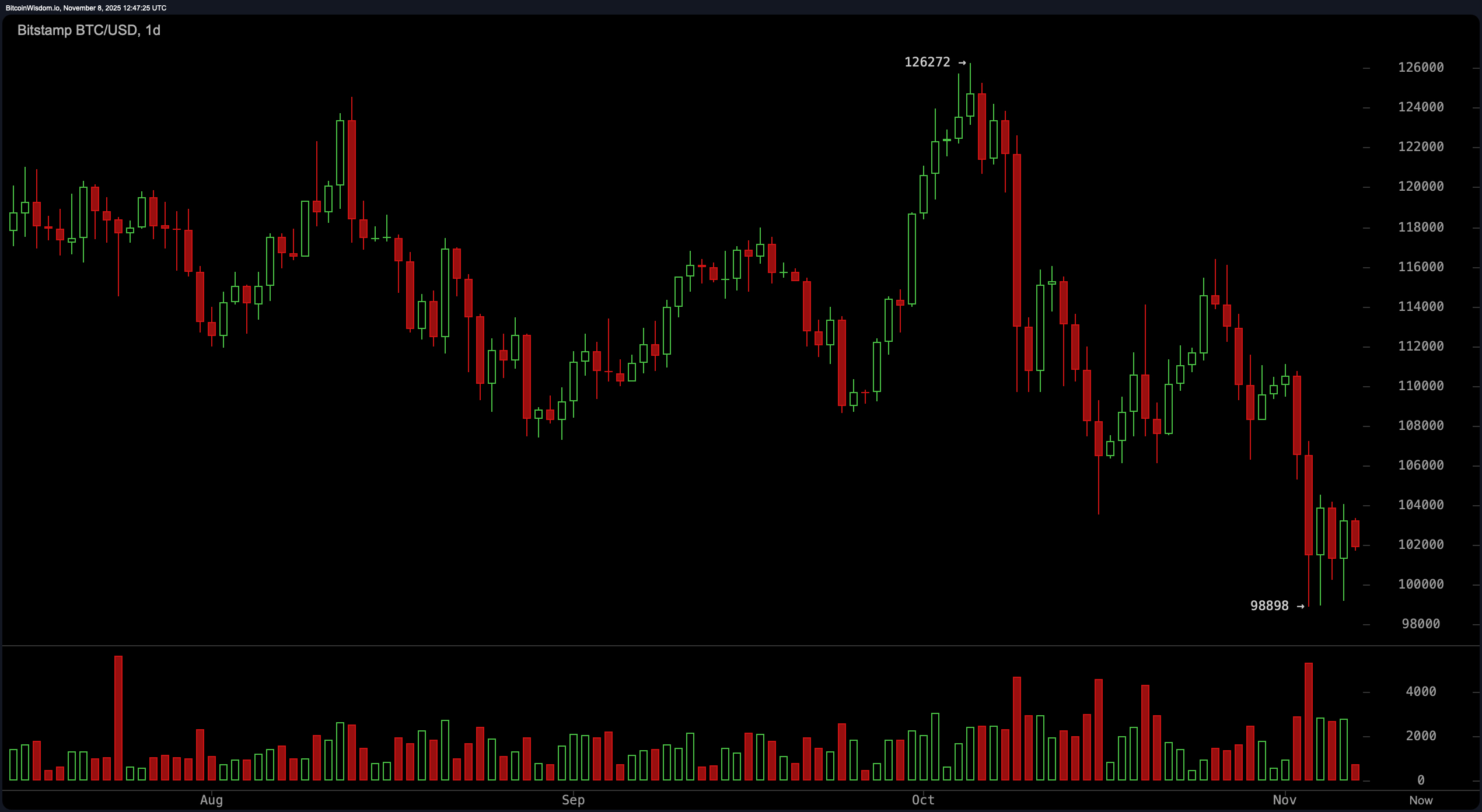 BTC/USD 1-day chart via Bitstamp on Nov. 8, 2025.