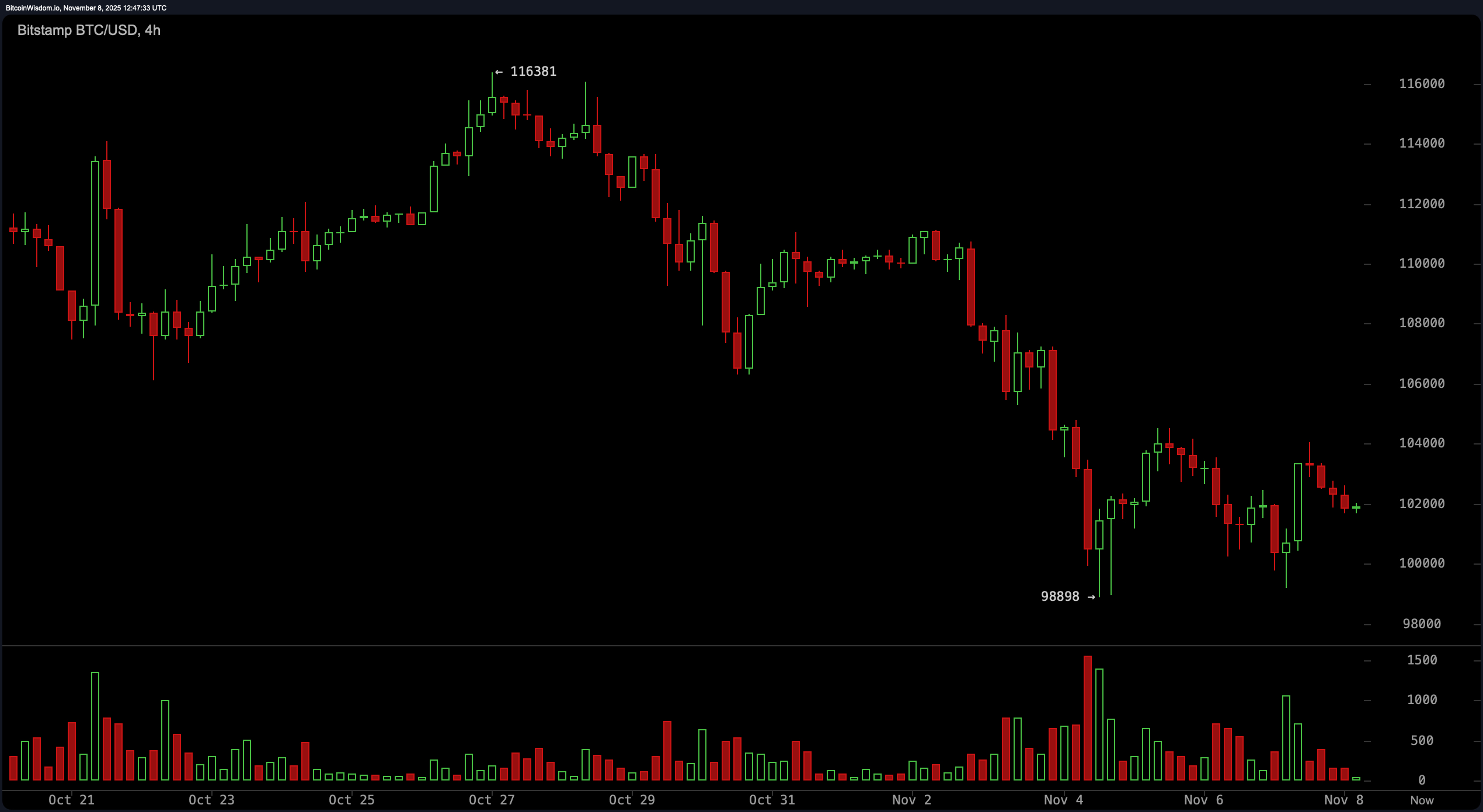 BTC/USD 4-hour chart via Bitstamp on Nov. 8, 2025.