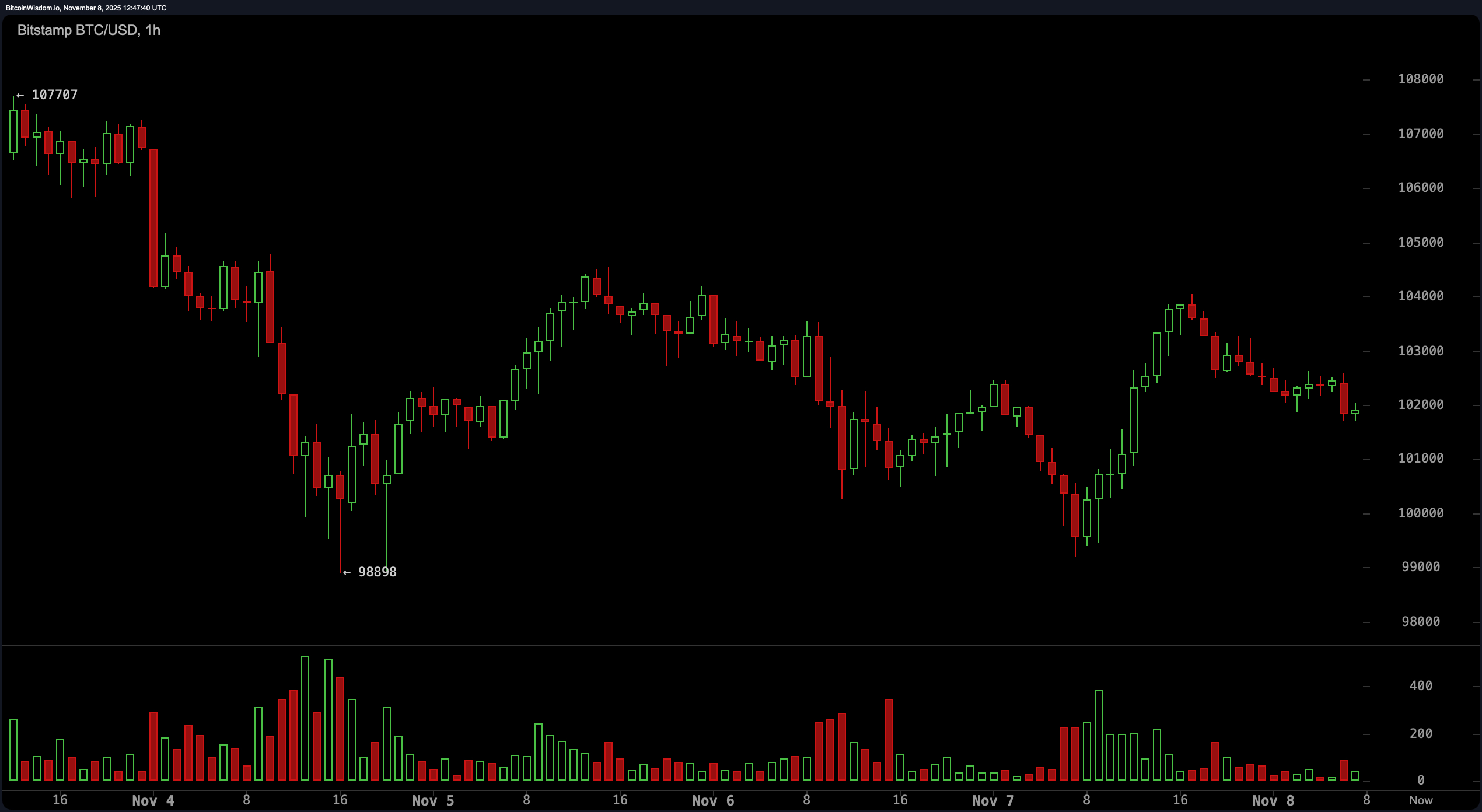 BTC/USD 1-hour chart via Bitstamp on Nov. 8, 2025.