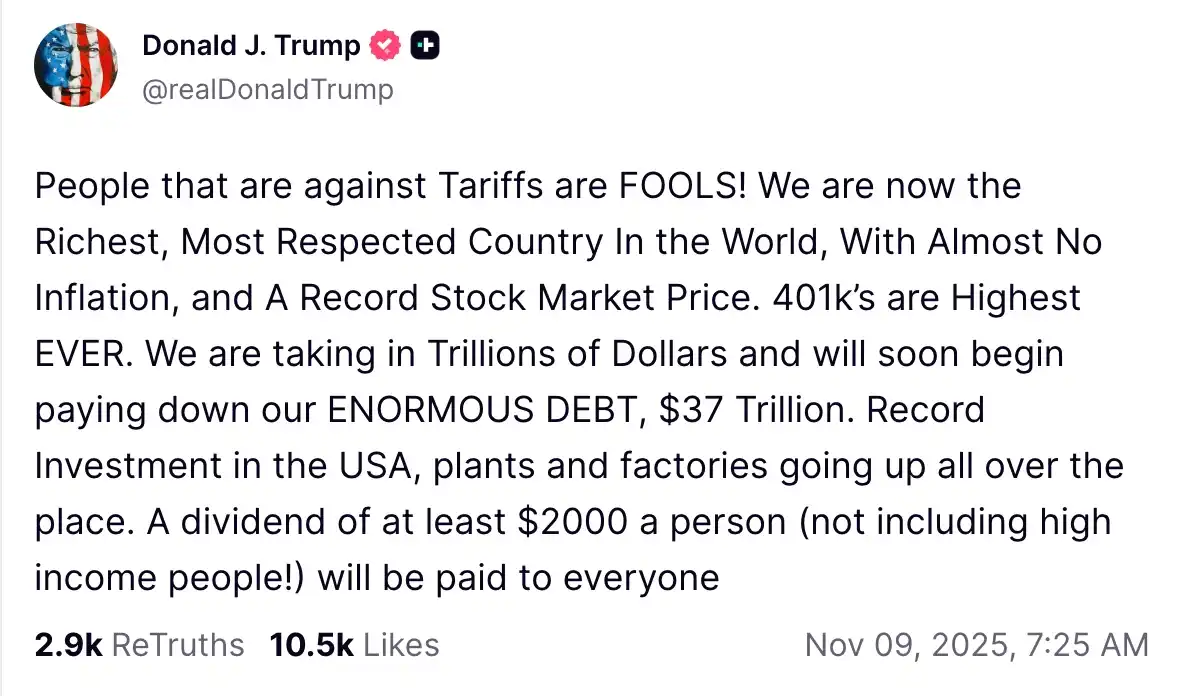 On November 9, he officially announced the plan on Truth Social: "We are collecting trillions of dollars and will soon start paying off our massive debt. Everyone (excluding high-income individuals!) will receive at least $2000 in dividends."