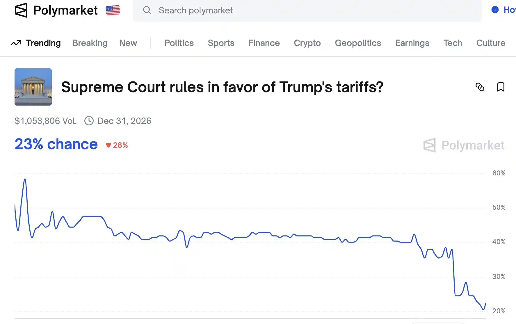 Behind the fervent emotions, a legal battle is underway. The U.S. Supreme Court is currently reviewing the legality of the tariffs. As of November 10, according to data from the decentralized prediction market Polymarket, traders give the probability of the Supreme Court's approval at only 23%; on the prediction platform Kalshi, this number is even lower, at just 22%. In other words, the majority of the market bets that the plan will ultimately be rejected by the judiciary.