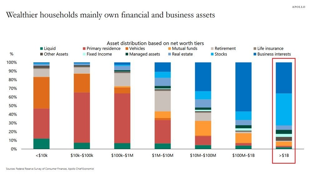 这张图的名字叫《Wealthier households mainly own financial and business assets》(越富有的家庭,主要拥有金融和企业资产)。它按净资产分了7个档次,从最底层的“不到1万美元”到顶层的“超过10亿美元”,展示了不同阶层的人,钱都花在哪儿了。
