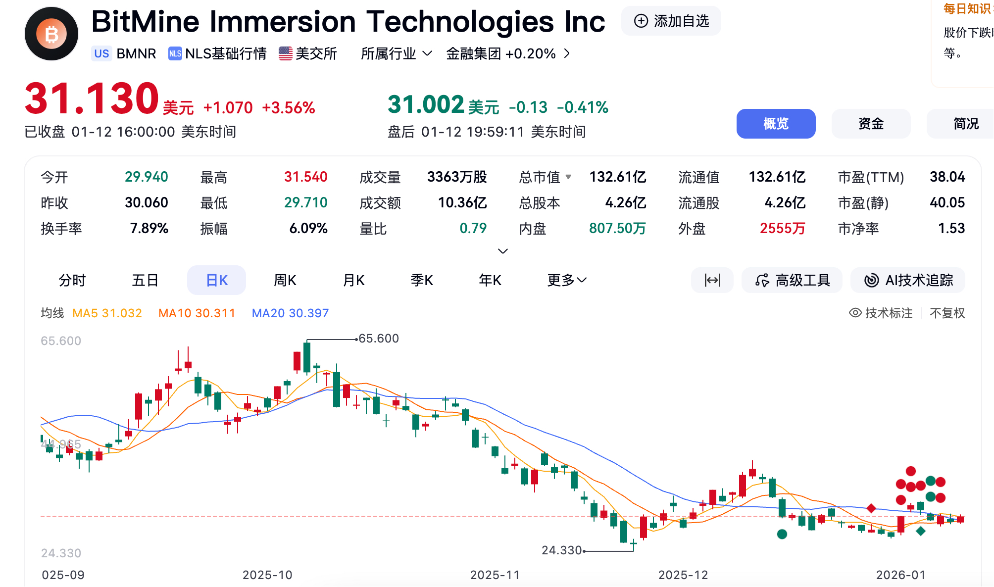 不过,二者也存在明显区别。BMNR 股价在 11 月底触及低点 24.33 美元后,自 12 月起便呈现出震荡上涨的趋势,一度重回 40 美元,目前市值为 132.61 美元;而 MSTR 股价则持续下行,在 1 月 2 日更是触及 149.75 的低点,当前市值已跌破 500 亿美元,约为 466.17 亿美元。