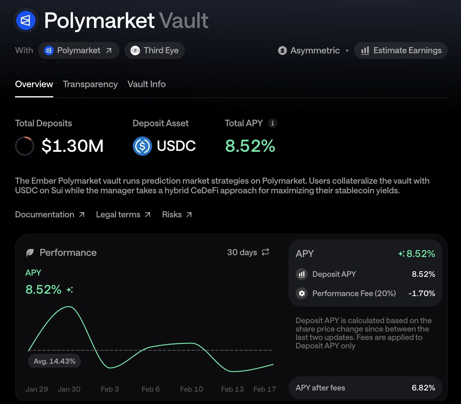 1 月 19 日,Sui 生态资金池管理协议 Ember Protocol 正式宣布推出了一款新的资金池产品 Polymarket Vault。该资金池由流动性基金 Third Eye 管理,该机构将负责在 Polymarket 上运行策略并创造收益,用户则可向该池内存入 USDC 并分享收益。