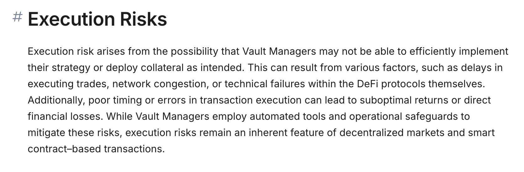 在关于管理方的策略执行风险方面,Ember Protocol 是这么描述的:“执行风险源于管理者可能无法有效实施其策略或按预期部署抵押品。这可能是由多种因素造成,例如交易执行的延迟、网络拥堵,或是 DeFi 协议本身的技术故障。此外,时机不当或交易执行错误可能导致回报不及预期或直接的经济损失。尽管管理者会采用自动化工具和操作保障措施来降低这些风险,但执行风险仍然是去中心化市场和基于智能合约的交易的内在特征。”