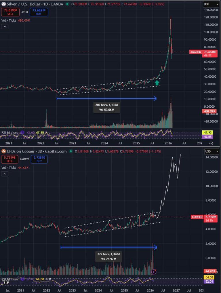 Bluntz shares a chart with his 338,000 followers on X, suggesting that copper is in the later stages of repeating silver’s explosive breakout from a multi-year ascending channel.