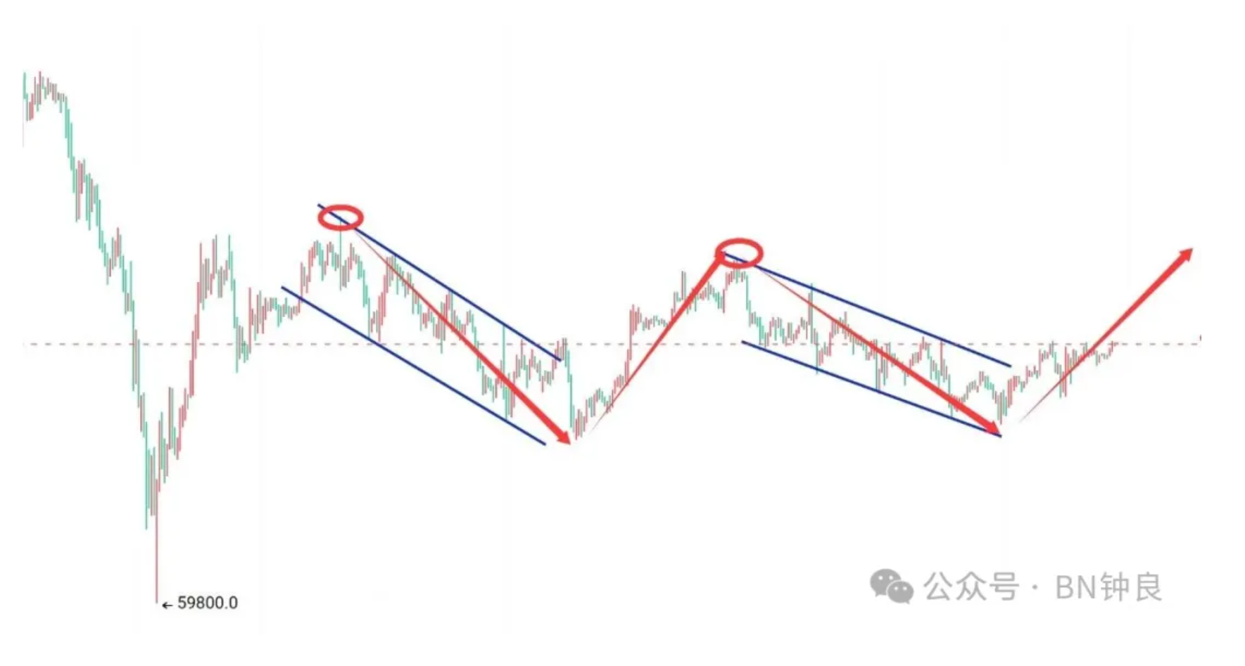 The market stopped dropping at 59800 and rebounded, reaching a high of 72300 before creating a small downward channel, with the lowest pullback stopping at 65081, followed by a rebound. After reaching a rebound high point around 70938, it faced pressure and formed another small downward channel, with the lowest pullback stopping at around 65595. Currently, the market is correcting and rebounding. As shown in the chart, the market has the potential to form an irregular W pattern, with the two bottom points at 65081 and 65595, and the two top points at 70938 and 72300. The high short positions for next week need to focus on the area below 70000; there is no need to chase short positions on a short-term basis because the second downward channel has not broken the previous low, making it easier to rebound and test the pressure upwards!