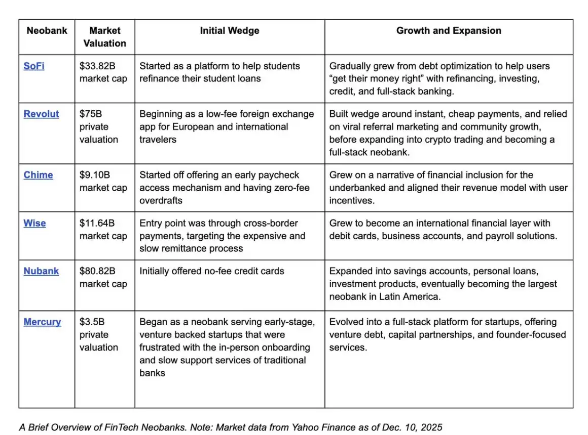 这一轨迹与金融科技新型银行的崛起高度相似:成功从来不只是「发卡」或「做 App」,而是掌握一个特定的用户群体,从学生(SoFi)、到低收入家庭(Chime)、到国际旅行者(Wise 与 Revolut),并在此基础上建立信任、忠诚度与规模化交易量。