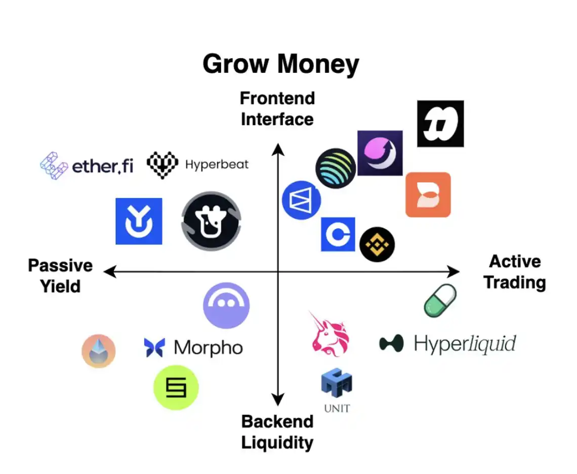 「加密新型银行」与用户建立的第三种关系,是帮助用户实现资金增值(grow money)。这是加密领域中创新最为密集的板块之一,催生了从 0 到 1 的多种金融原语——从质押金库、永续合约交易,到代币发行平台与预测市场。与前文类似,我们同样可以沿着两个维度来对「资金增值」类应用进行分类:从被动收益到主动交易,以及从前端界面到后端流动性。