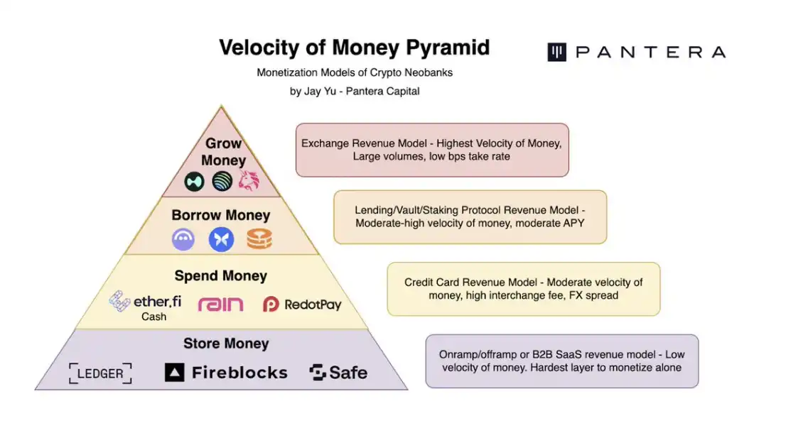 位于金字塔顶端的是资金增值(growing money),其资金周转速度最高(例如 Hyperliquid 的交易手续费);其次是借贷(通过利息变现);再往下是支付(通过手续费与外汇价差);最底层则是存储(主要通过出入金费用与 B2B 集成变现)。