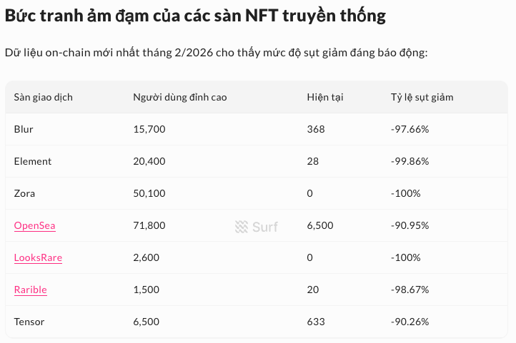 Nếu nhìn lại thời kỳ đỉnh cao, NFT từng là tâm điểm của cả thị trường. Nhưng hiện tại thì bức tranh đã hoàn toàn khác.