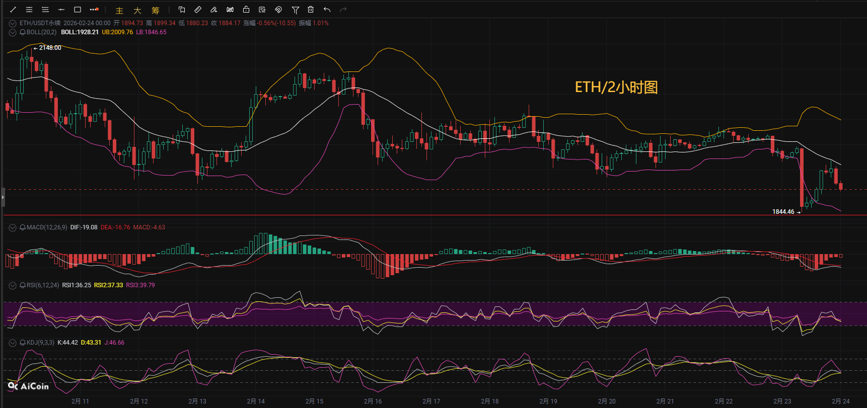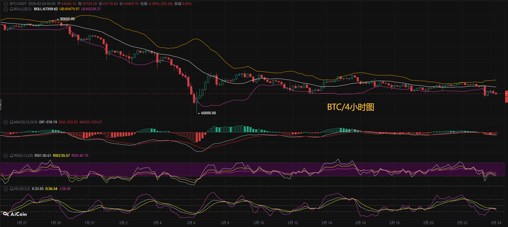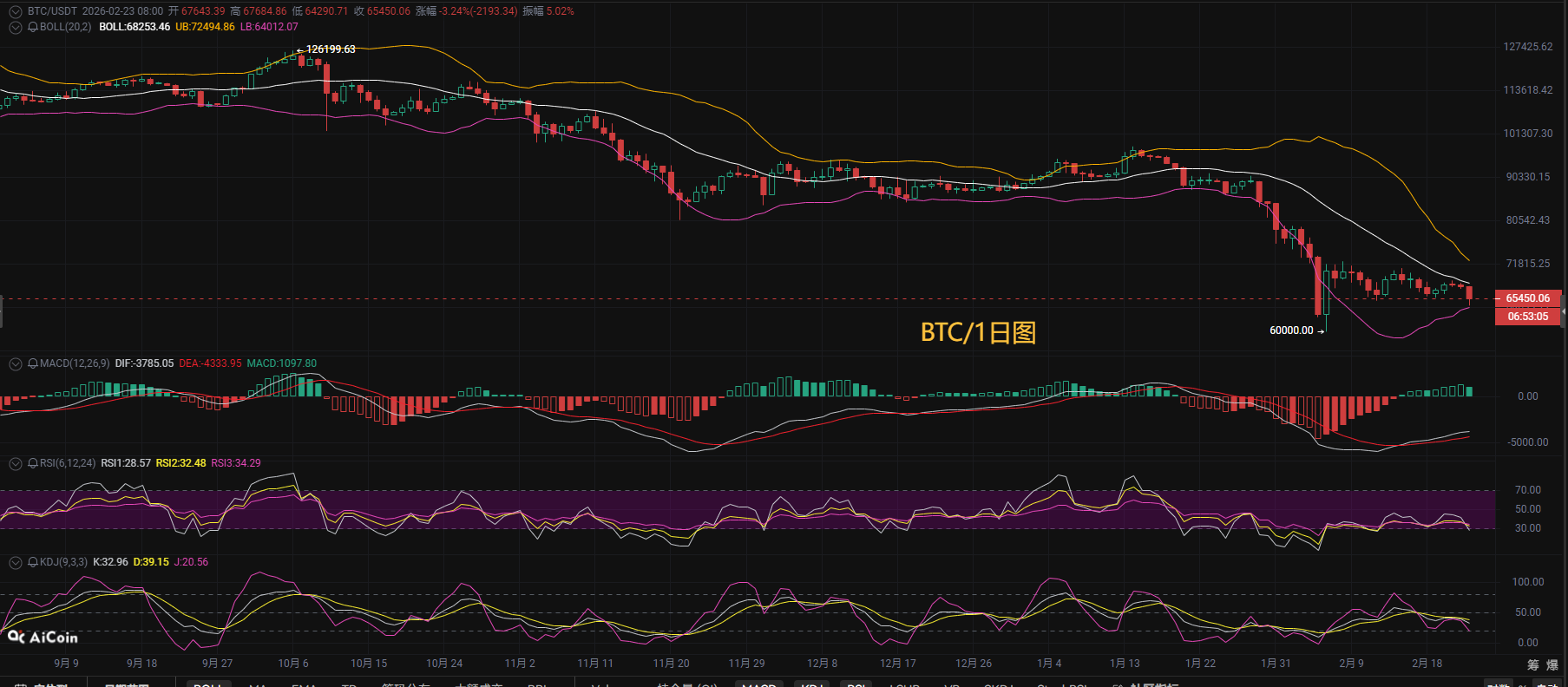 After a continuous series of bearish candles on the daily chart, on February 23, there was a long lower shadow testing the support at 64,290 and rebounding, indicating a release of short-term selling pressure. The weekly chart shows a double top structure (79,200/71,400), and the current price has broken below the neckline at 68,000, which corresponds to a measured target pointing to the 60,000 area. In terms of MACD, the fast and slow lines on the daily chart are diverging after a death cross below the zero axis, but the histogram has begun to contract, indicating a weakening of short-term bearish momentum, while the high position death cross on the weekly MACD confirms the medium-term adjustment trend. From the perspective of moving averages, the price is being suppressed by EMA7 (67,278) and EMA30 (72,960), resulting in a weak intraday trend. Therefore, our short-term strategy still focuses on rebound short positions, paying attention to resistance in the 67,500-68,500 range, and monitoring key support at the 64,000 level.