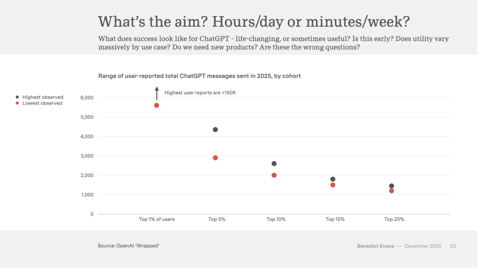 Data shows that only 5% of ChatGPT users pay, and even among American teenagers, the ratio using it a few times a week or less is much higher than the ratio using it multiple times a day. OpenAI disclosed during its "2025 Annual Summary" event that 80% of users sent fewer than 1,000 messages in 2025, which, at face value, translates to an average of less than three prompts per day, with actual chatting being even less.