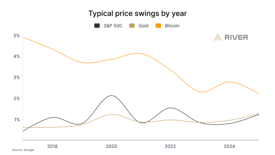 Bitcoin has continued a decade-long trend of decreasing volatility and is approaching the levels of gold and the S&P 500.