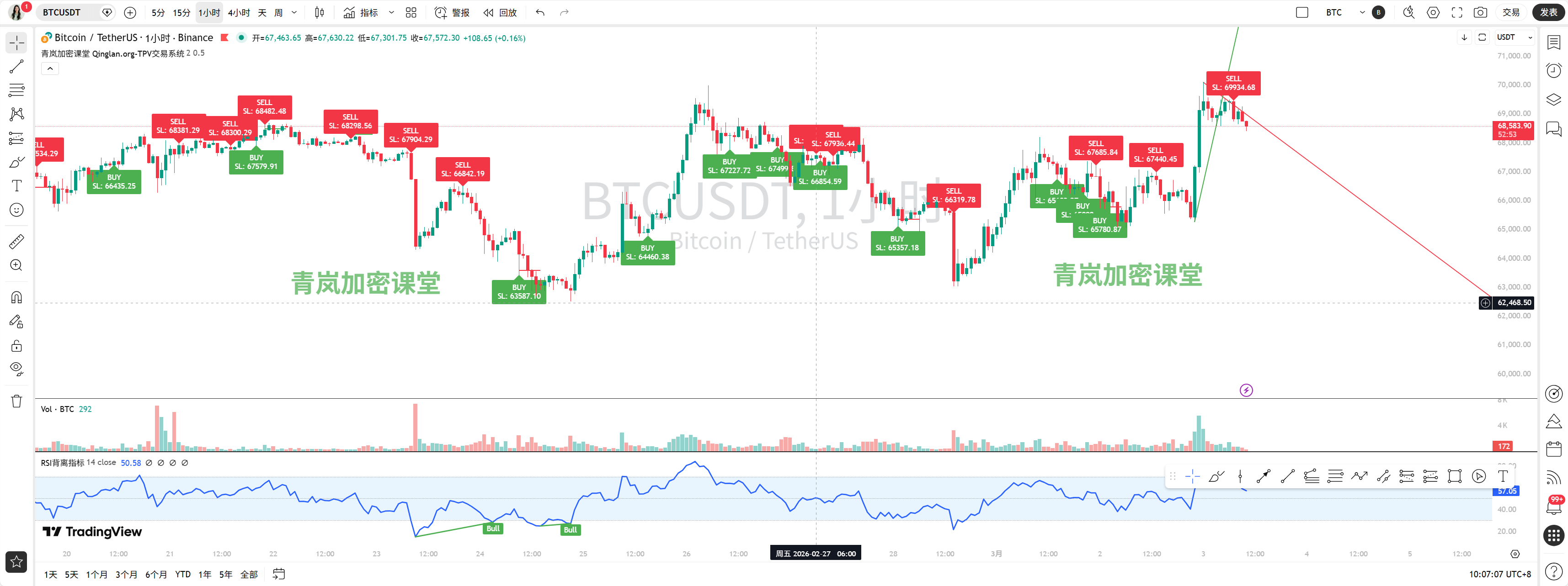 • 日线级别(长期趋势):目前价格(~68900)稳稳站在所有短期均线(MA5/10/20)上方,MA5(67273)已经拐头向上,这是一个积极的信号。MACD虽然还在水下,但绿柱(BAR)已经连续两天大幅放量,快慢线(DIF/DEA)也在强势收敛,显示下跌动能衰竭,长期趋势正在从下跌转为筑底反弹。关键阻力在前期高点70000-71000区域,支撑在MA5(67200)附近。