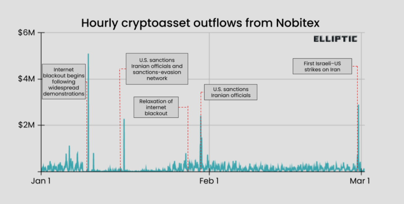这并非孤立事件。Elliptic 的追踪显示,自 2026 年 1 月以来,Nobitex 已出现多次外流峰值:1 月 9 日,伊朗境内爆发大规模示威,政府随即实施互联网封锁,当日外流量创下年内最高纪录,甚至在断网期间仍有部分资产持续流出,说明有人能够绕过封锁继续操作;此后,美国财政部对两家与伊朗关联的英国注册交易所(Zedcex 和 Zedxion)实施制裁,Nobitex 外流量再度短暂飙升。