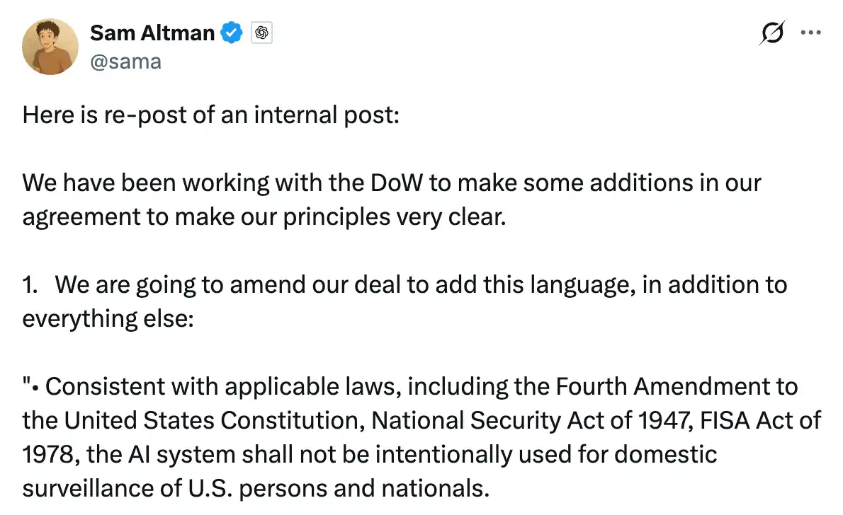 空出来的位置,很快有人填上了。就在同一天晚些时候,OpenAI 宣布和五角大楼签约。奥特曼在周四的内部信里,立场还是清晰的,他写道这已经是「整个行业的问题」,说 OpenAI 和 Anthropic 持有相同的「红线」:反对大规模监控,反对自主武器。周五,协议达成,将在军方机密网络部署模型,限制只能在云端运行,派驻工程师监督,并称已在合同里写明了相同的两条限制。