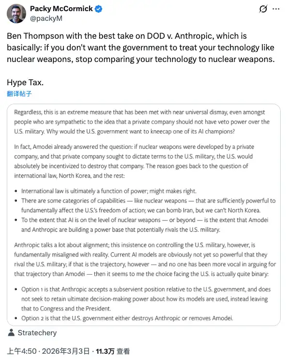 科技评论人 Packy McCormick 在这件事发酵期间,引述了 Ben Thompson 的一个概念:Hype Tax。意思是,如果你用极端叙事来建立自己的影响力,那么当这套叙事遇到真正的权力时,你就要为它付账。你把 AI 技术比作核武器,政府就会用对待核武器的方式对你。