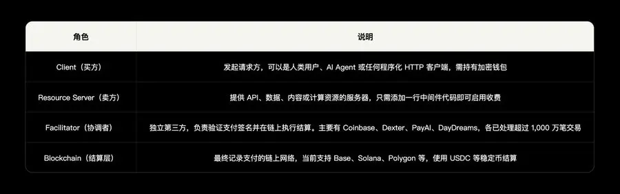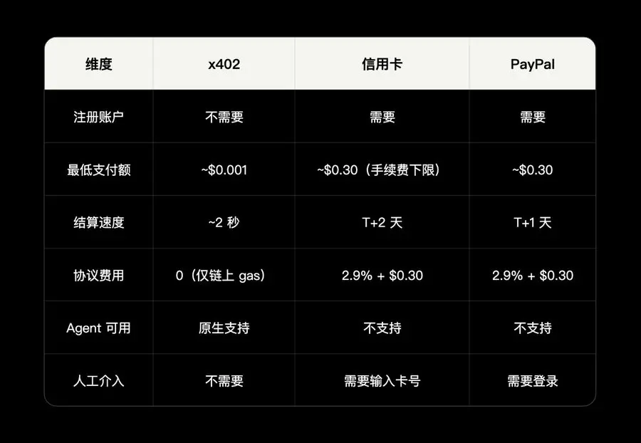 核心特征:无需注册账户、无需 API Key、无需订阅、无需人工介入。支付像发送 HTTP 请求一样自然,这正是它被称为“互联网原生支付层”的原因。
