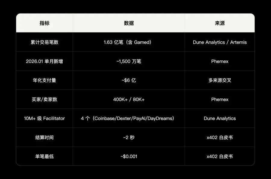 x402(支付层)由 Coinbase 与 Cloudflare 联合推出,将稳定币微支付嵌入 HTTP 协议层。截至 2025 年底已处理超过 1 亿笔交易,年化支付量达 6 亿美元。