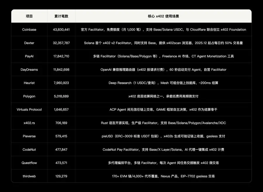 数据来源:Dune Analytics x402 Transactions per Project 面板