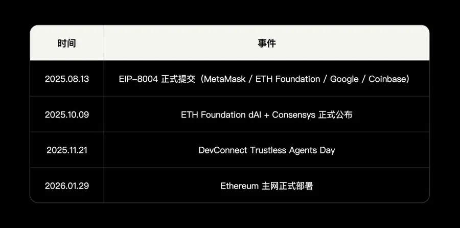 ERC-8004(信任层)由以太坊基金会 dAI 团队联合 MetaMask、Google、Coinbase 提出,为 AI Agent 提供链上身份、声誉和验证三大注册表,于 2026 年 1 月 29 日上线以太坊主网。