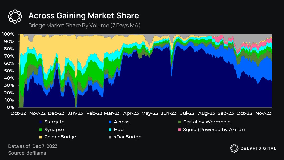 @AcrossProtocol stands out as the most mature intent-based bridge. Particularly active in pathways between Ethereum and its rollups coupled with rising adoption of rollups, Across has gained substantial market share.