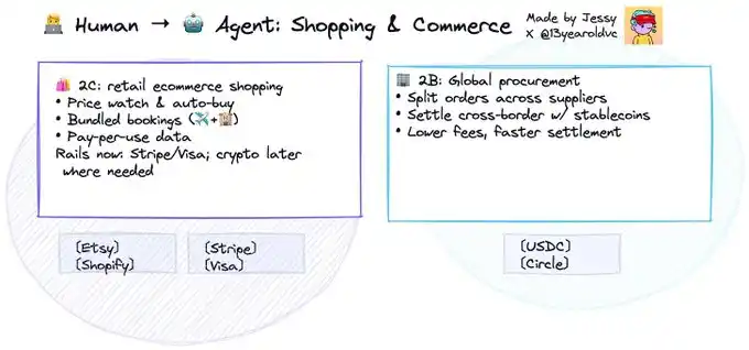 In the short term, most of these payment processes will still be completed through traditional channels like Stripe or Visa—this is fine. For retail e-commerce (2C), the existing infrastructure is already sufficient to support the "Human → Agent" interface, at least for now.