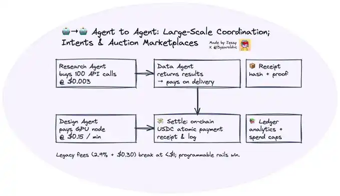 Imagine a research agent purchasing 100 API calls from a data agent; a design agent paying for GPU usage time from a compute node. These are transactions between machines, high frequency, and low amounts.
