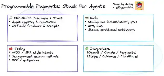 As the infrastructure gradually improves, two key standards are emerging: ERC-8004 provides a trust layer that allows agents to discover and collaborate without centralized intermediaries; x402 enables instant, frictionless payments between agents.