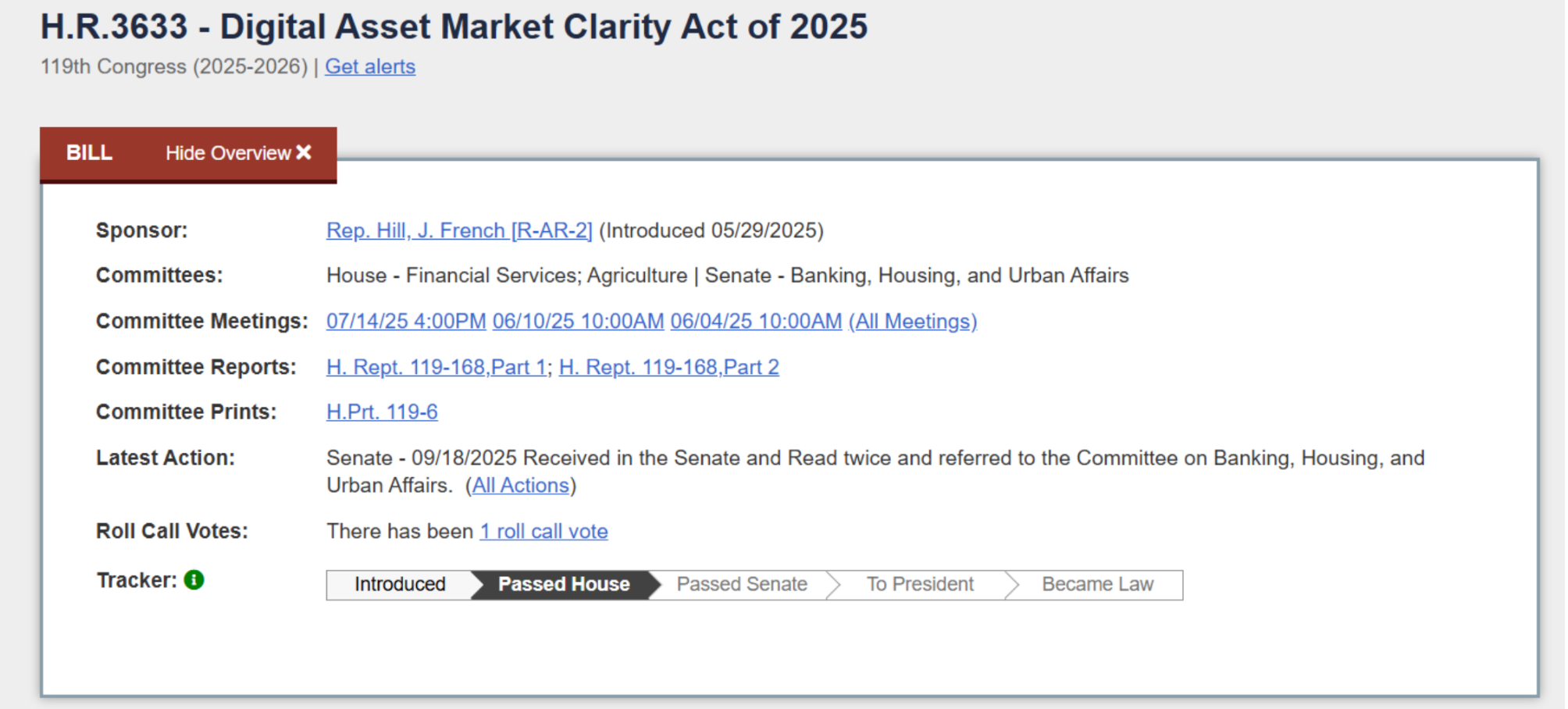 On July 17, 2025, the CLARITY Act was passed in the House with 294 votes in favor and 134 against. The bill was then sent to the Senate for review. However, just a few days after the House passed it, the Senate Banking Committee also proposed a competing crypto market draft that runs parallel to the CLARITY Act. The Senate Agriculture Committee and Banking Committee held discussions and publicly solicited opinions on their respective jurisdictions' digital asset legislation, planning to merge the two proposals into a unified Senate bill for a vote in 2026.