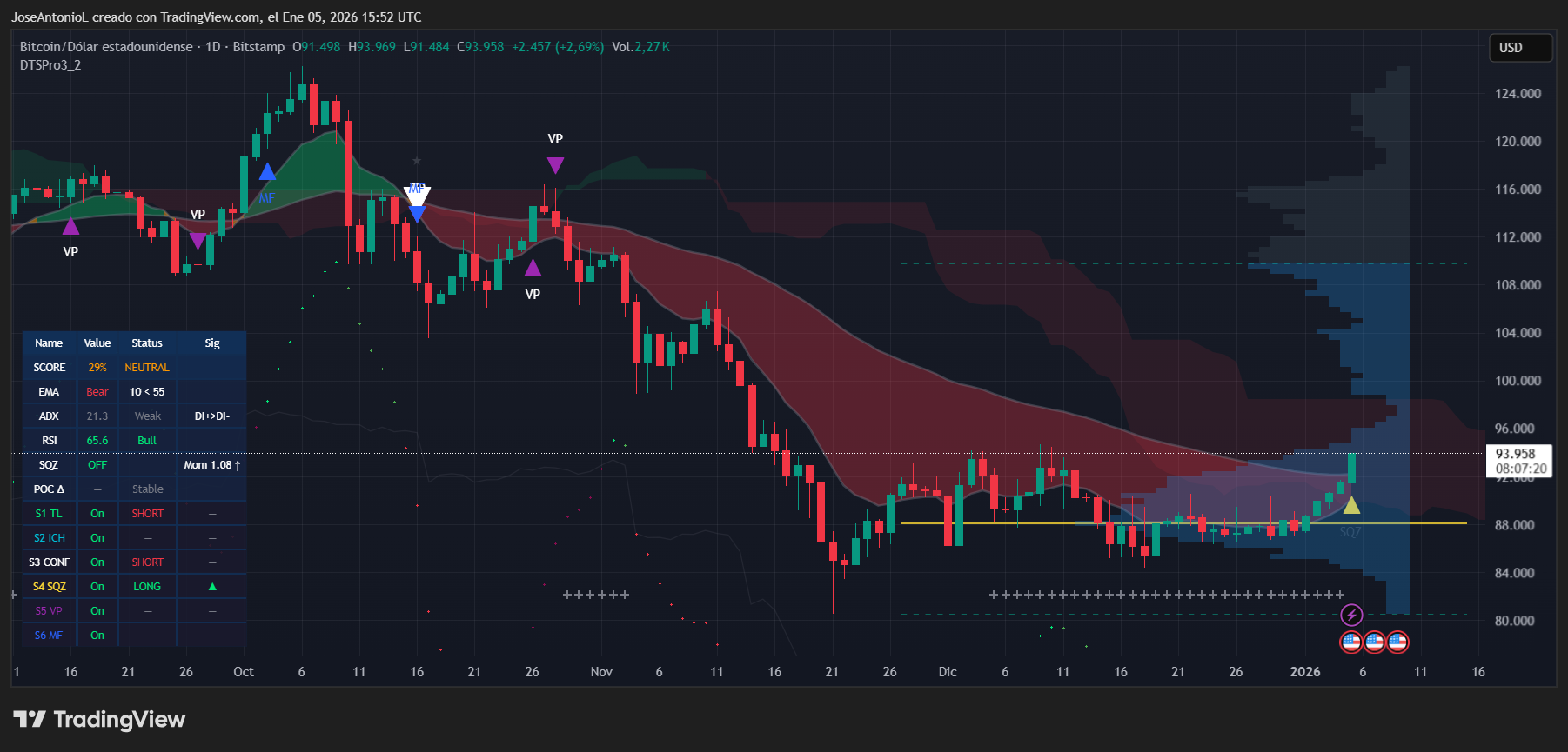 The Relative Strength Index, or RSI, measures market momentum on scale from 0 to 100, with readings below 30 signalling oversold and above 70 suggesting overbought. At 65.6, Bitcoin is showing buying momentum without being overbought. At the moment, Bitcoin is in that sweet spot where momentum is building but hasn't yet reached exhaustion levels that typically trigger profit-taking.