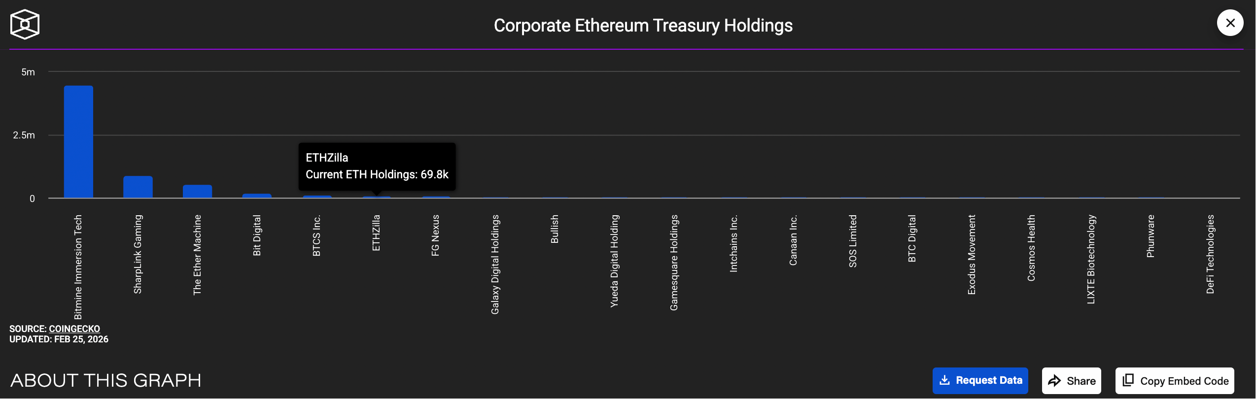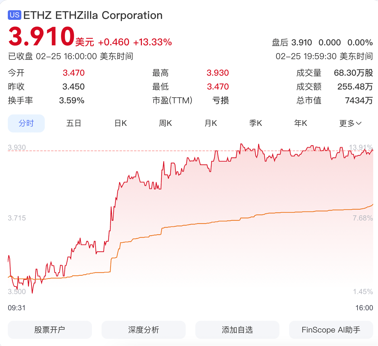 Approved by Nasdaq, the company's common stock will start trading on Nasdaq Capital Market under the new stock code "FRMM" from March 2. After the transformation, the company will strategically upgrade and build a digital asset platform focused on institutional-level RWA tokenization, connecting traditional capital markets with blockchain financial infrastructure. On the day the announcement was made, the price of ETHZilla (ETHZ) surged more than 13% to approximately $3.91, reaching the highest level in February, but still plummeting over 96% compared to the peak of $107 in August 2025.