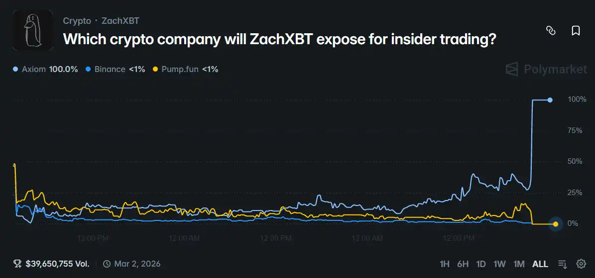 Due to the high quality of the information ZachXBT previously disclosed, the topic on Polymarket surpassed $10 million in trading volume just a few hours after its launch. By the evening of the 26th, ZachXBT officially announced that the involved company was Axiom, a decentralized trading platform that has approached $400 million in total revenue since its founding in 2024.