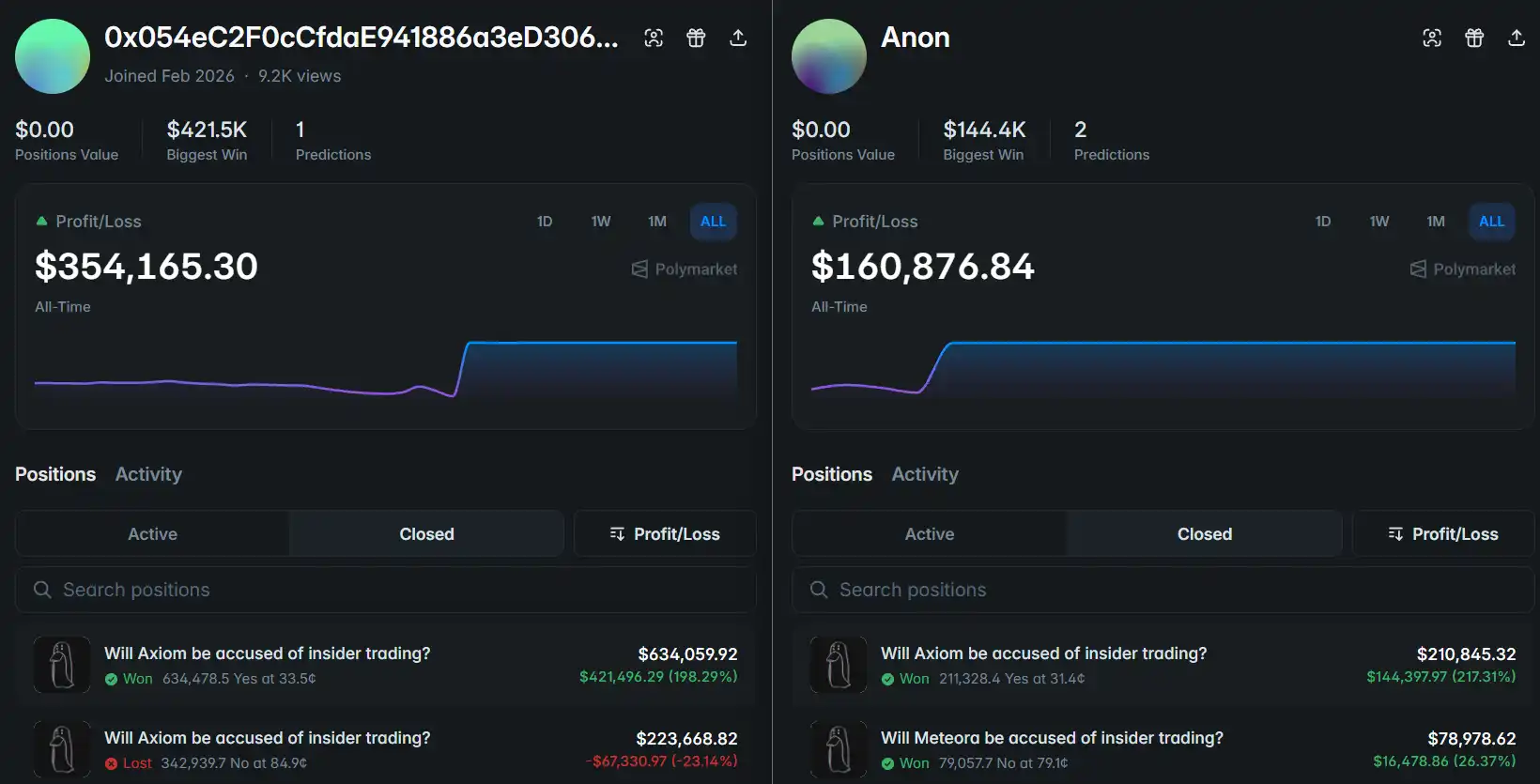 In the market "ZachXBT will accuse Axiom of insider trading," two addresses stood out significantly, as they made excessive profits—one earned $350,000, and the other $160,000.