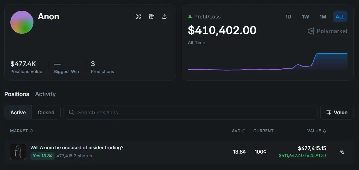 Besides Bauer, there was another account that was also noteworthy: by betting on Axiom being accused, this account profited over 6 times, earning $411,000.