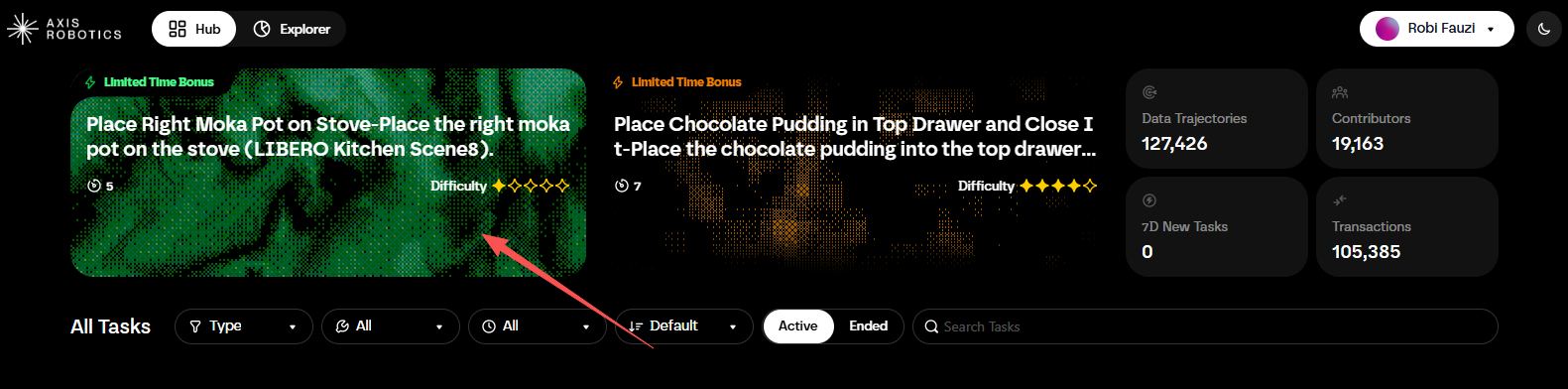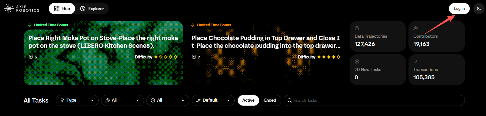 STEP 1. Visit the interaction website (link: https://hub.axisrobotics.ai/?tab=hub), click "Log in" to log in to your account.