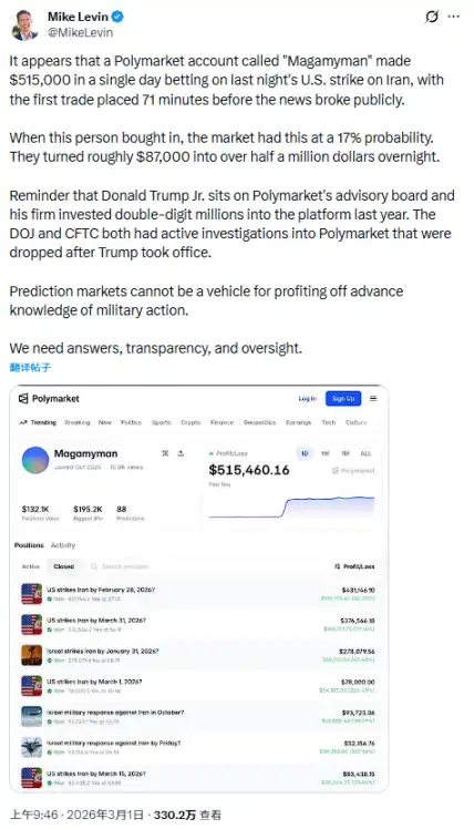 Additionally, according to a post by Mike Levin on the social platform X, among the six accounts, one named "Magamyman" made a profit of $515,000 in a single day, with its first trade occurring 71 minutes before the news coverage became public.
