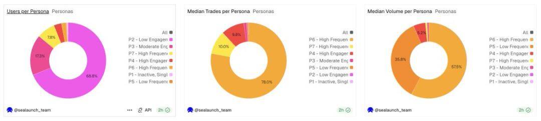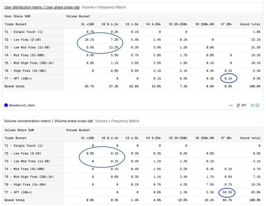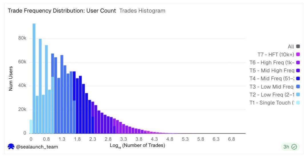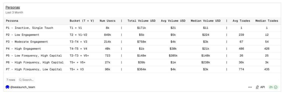 Note: All data in this article comes from the Dune data dashboard, with the analysis period covering nearly three months of wallet-level total behavior; user profiles are classified based on transaction frequency (T1–T7) and trading amount (V1–V7), with the amount measured in dollars.