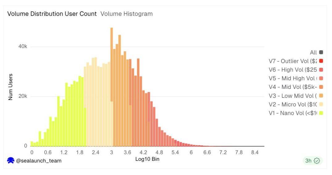 In contrast, the trading volume distribution is completely different. Although transaction frequency sharply declines from the left side, the volume histogram shows a bell shape under a logarithmic coordinate system, peaking at around $600 to $3000 per user. This means that a typical active user's trading amount is in the four-digit range, but the number of users on the right tail starting from $25,000 is relatively small, yet they account for the vast majority of the platform's trading volume.