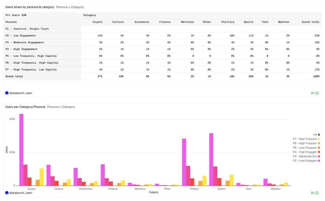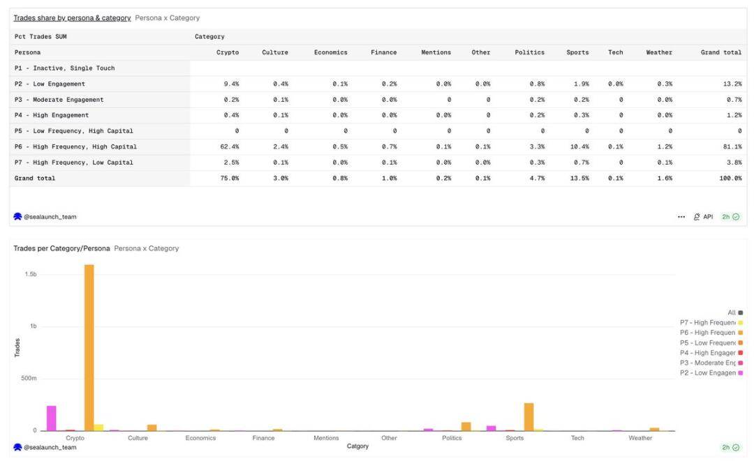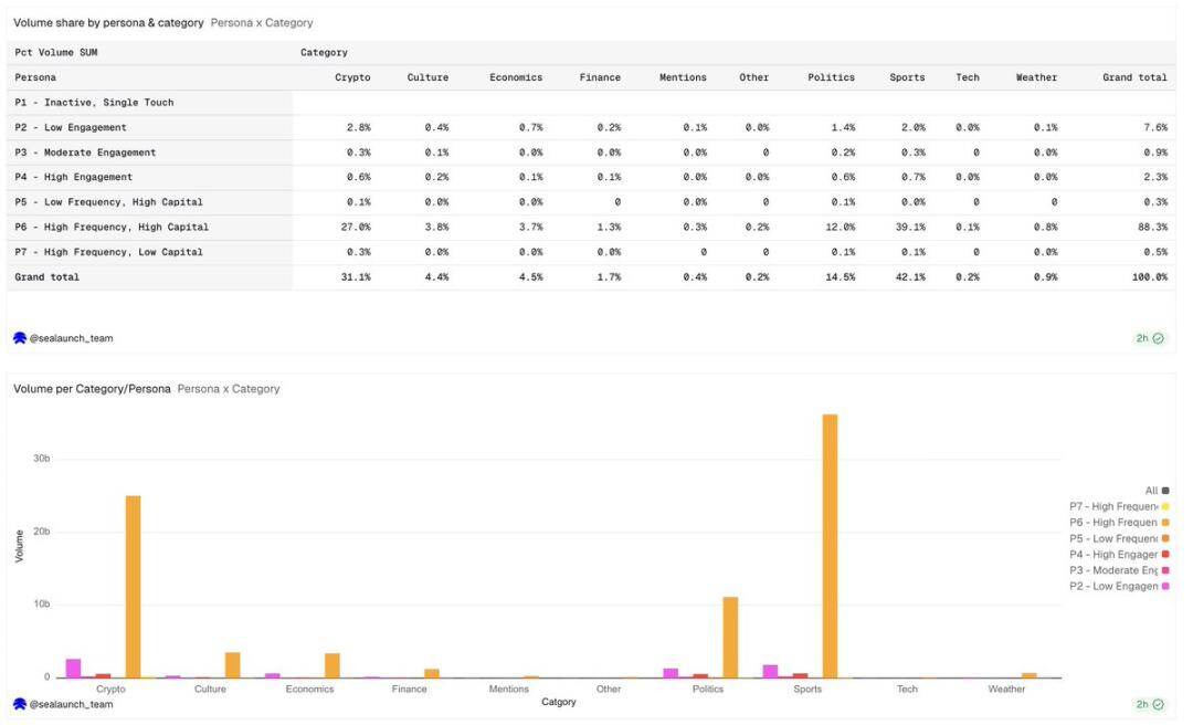 The political category has the highest user proportion, reaching 19%, but the user number is relatively evenly distributed among all user groups. Low participation users (P2) have the highest proportion among political users; compared to other categories, these users are typically event-driven one-time retail investors, registering to participate in election betting.