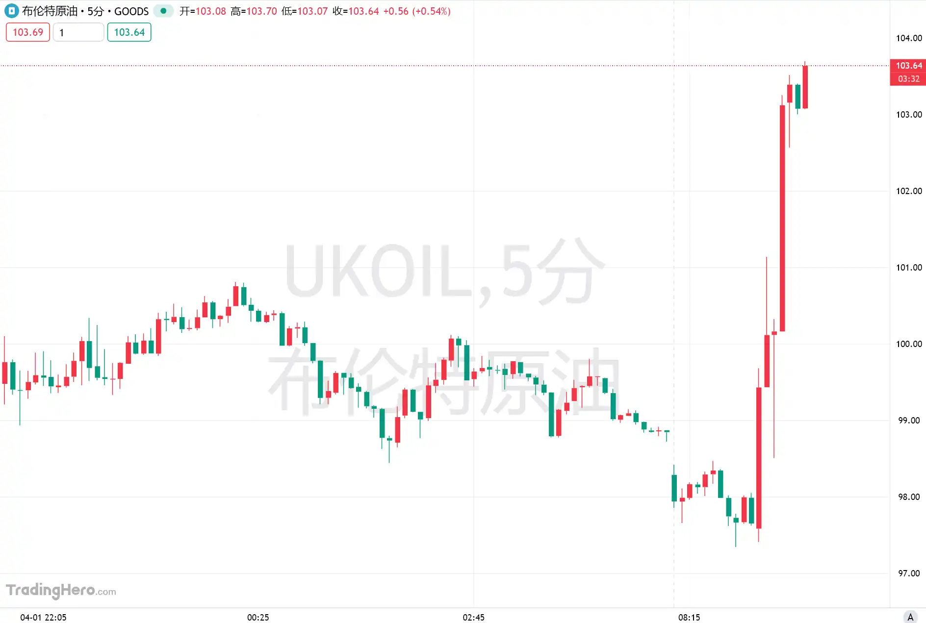 Due to Trump's threat to strike Iranian energy facilities if no agreement is reached, oil prices continued to rise, with WTI crude oil breaking through $103 per barrel, increasing more than 4% within the day. Brent crude oil surged $4 within the day, reported at $102.86 per barrel, a rise of 4.06%.