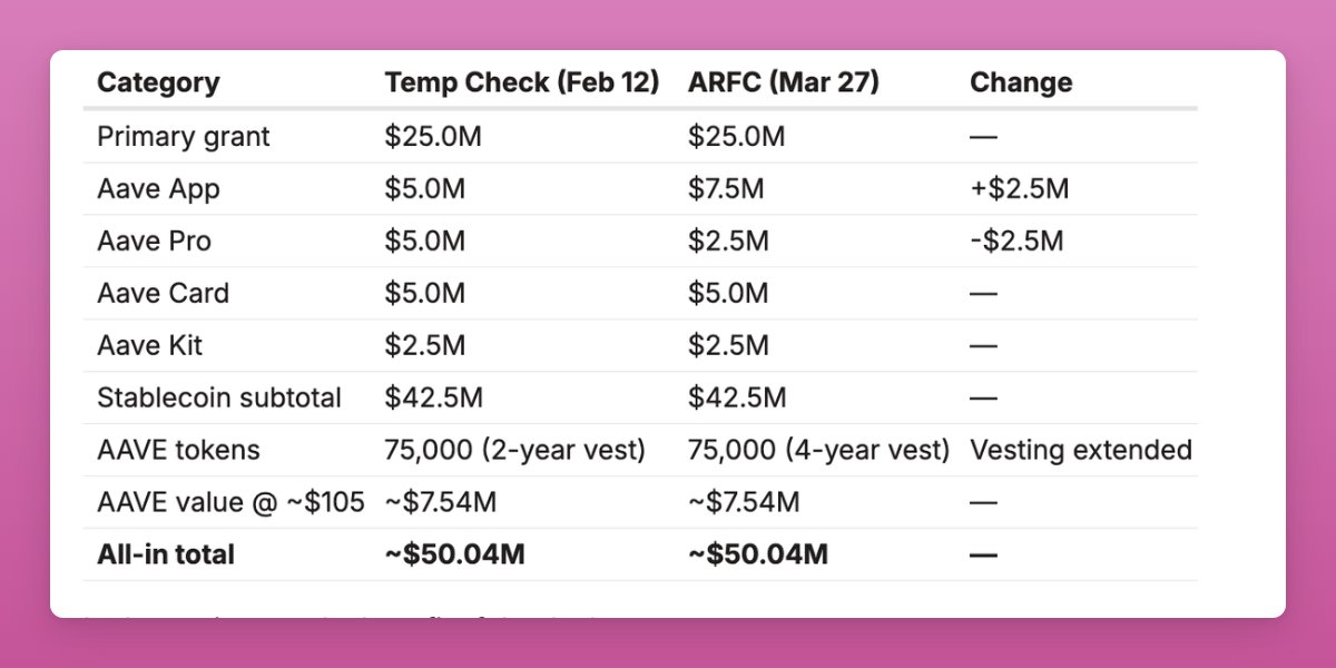 - Aave Pro grant cut from $5M to $2.5M, Aave App raised to $7.5M but milestone-gated
