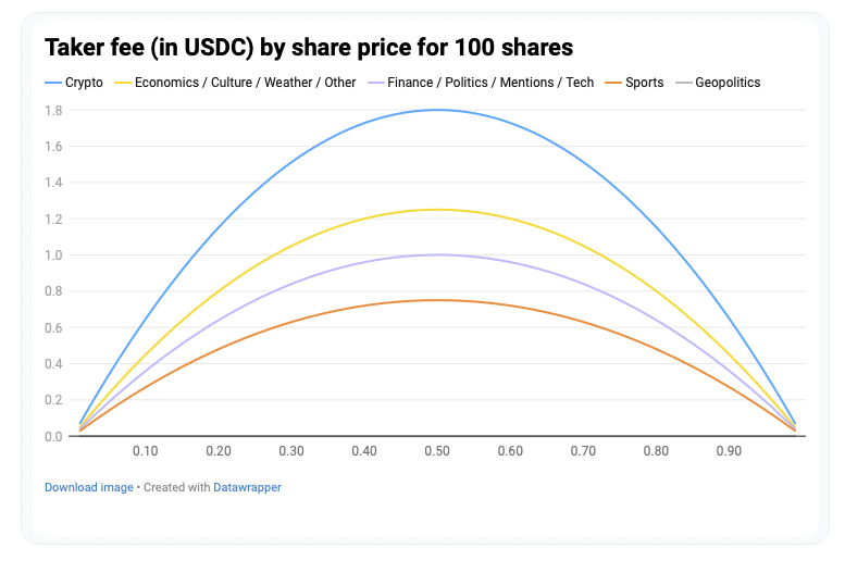 Crypto: Peaks at about 1.80% (highest fee when probability is close to 50%).