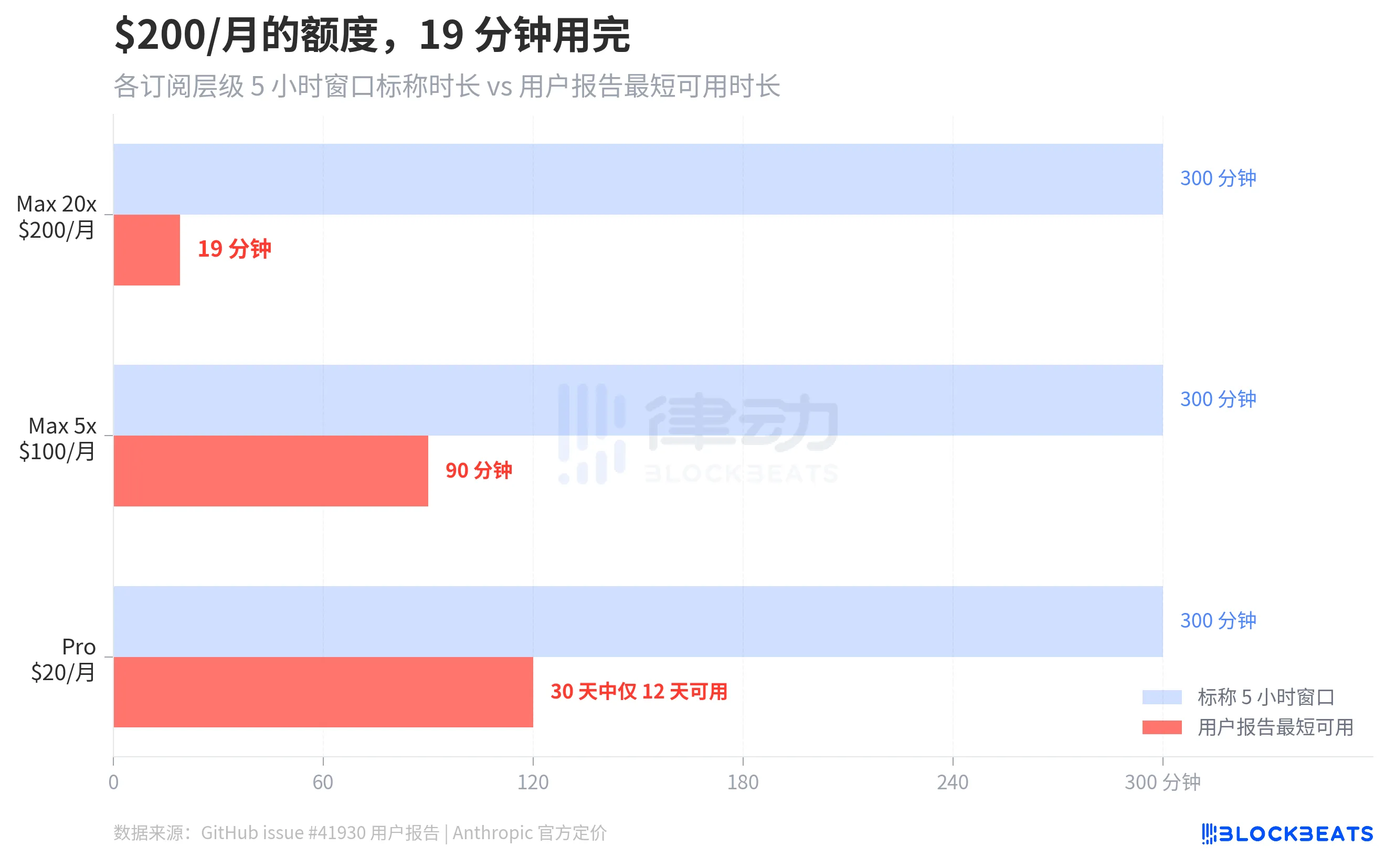 GitHub issue #41930 collected hundreds of user reports. The most extreme case is a Max 20x subscription user ($200/month), whose 5-hour rolling window was completely exhausted in just 19 minutes. A Max 5x user ($100/month) reported that their 5-hour window was used up in 90 minutes. According to The Letter Two, other users claimed that a simple "hello" consumed 13% of their session quota. One Pro user ($20/month) said on Discord that their quota "runs out every Monday and resets on Saturday," allowing them to use it normally for only 12 days in 30 days.